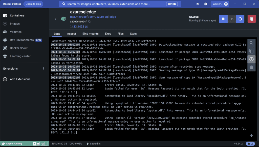 Alternatively, you can navigate to the Azure SQL Edge container and click on the top right Stop button