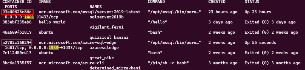Note, the Container ID for both SQL Edge and SQL Server 2019 as these will be needed will be needed later on.
