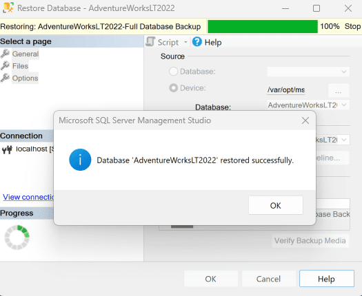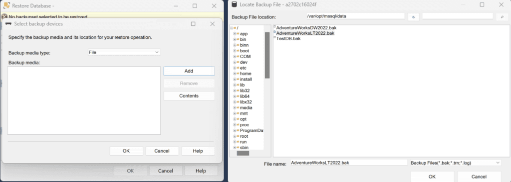 docker cp C:Users<yourUser>DownloadsAdventureWorksLT2022.bak <container Id>:/var/opt/mssql/data/AdventureWorksLT2022.bak