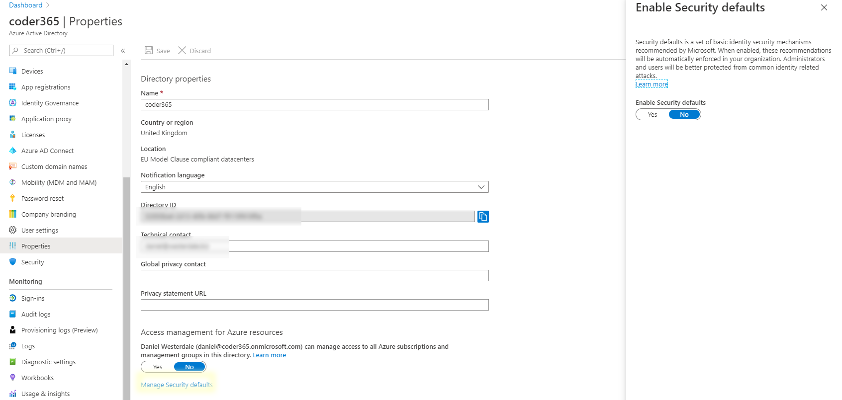 Navigate to the properties option in the Azure AD admin portal. then, click on the Manage Security Defaults link at the bottom of the screen.